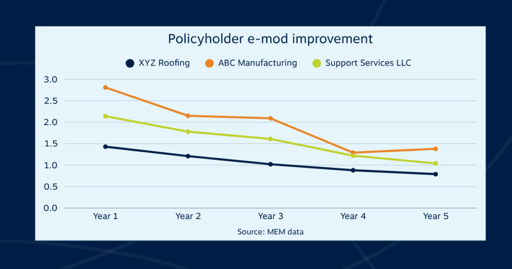 At MEM, we’ve been helping businesses improve their e-mods for decades. Here are three examples of real policyholders (names anonymized) who reduced their e-mods over five-year periods with us.