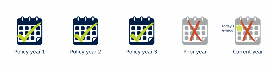 Your e-mod uses three years of claims data, but not the most recent years. We exclude the current and previous years because claims reported during those years are still developing. Medical costs can change, and new claims might still be reported.